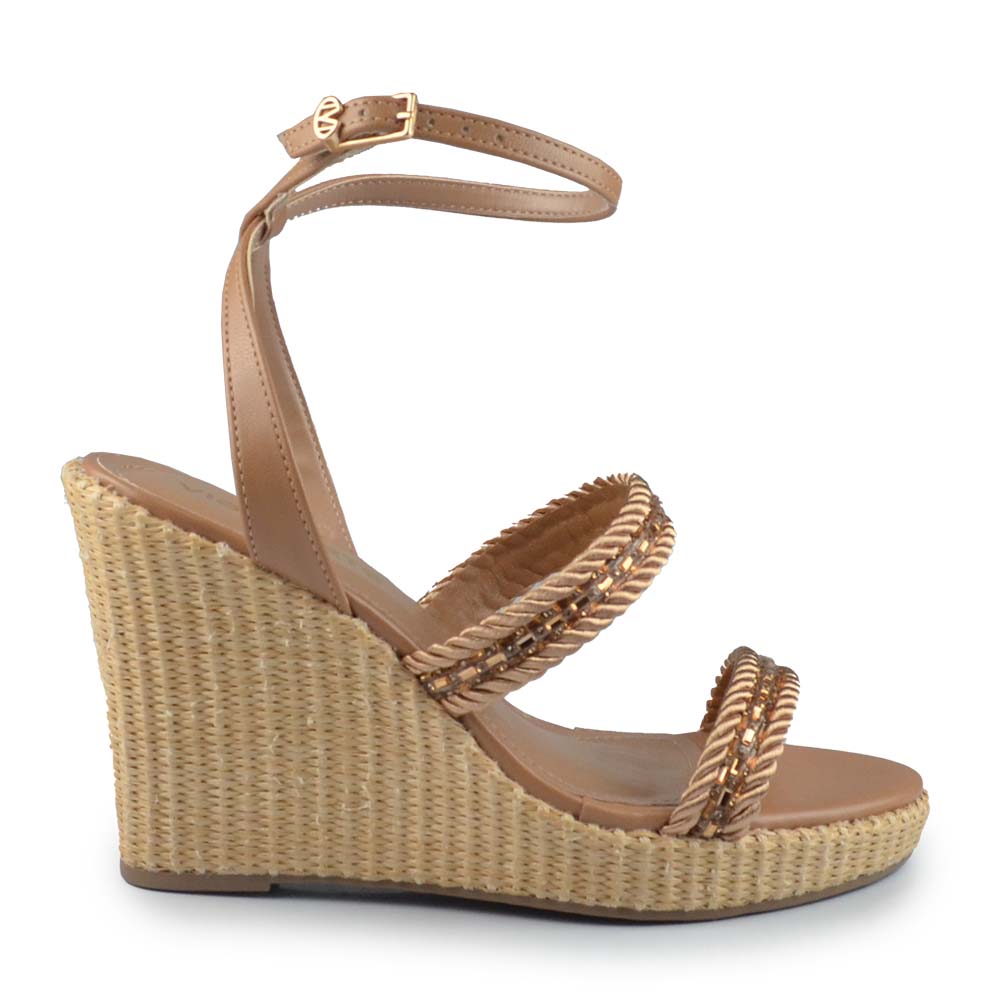 O destaque fica por conta da forração em tramas naturais, que remete ao estilo rústico e artesanal uma tendência forte na moda atual. O calcanhar aberto, com tira modelada e fechamento em fivela no tornozelo, garante ajuste ideal e segurança ao caminhar.